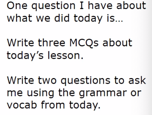 • Teresa spoke about how she used to always have questions on the board as learners entered so that it got them thinking, allows for time for all learners to arise, great way to start with emergent language, and allows for personalisation of content. A lot of really interesting reasons for starting the lessons with questions!