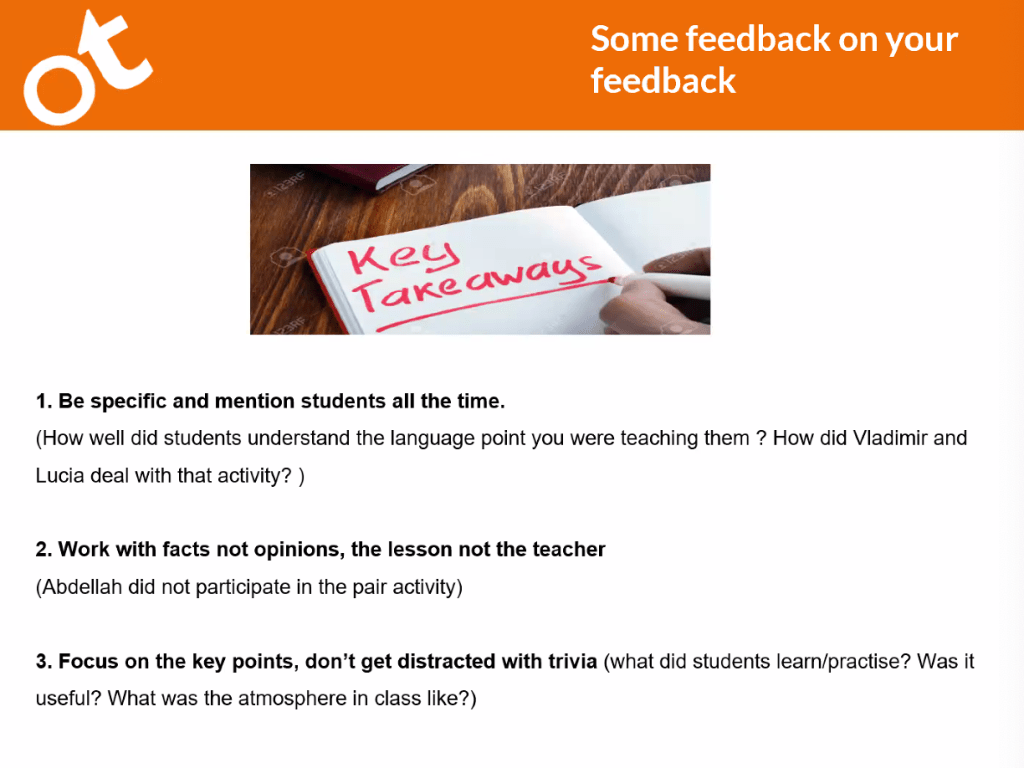 I have been guilty of some of these, so this session was an excellent reminder of how I can still improved in the delivery of feedback. I really liked the focus on the learners much more than the teachers. I have found that teachers actually want to focus on themselves, and so I must try harder to put the focus on the learner and the learning!