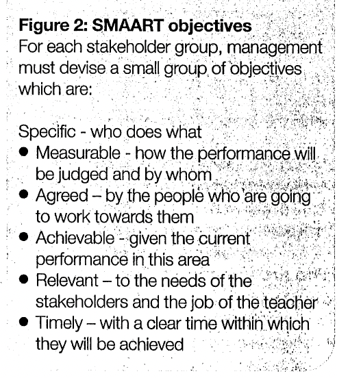 | Teachers need to be aware that they are constantly being judged by all stakeholders connected with the business they work in. (p.13) | And managers need to raise this awareness, and provide support so teachers can actually (as much as they can) meet the expectations of those stakeholders. |