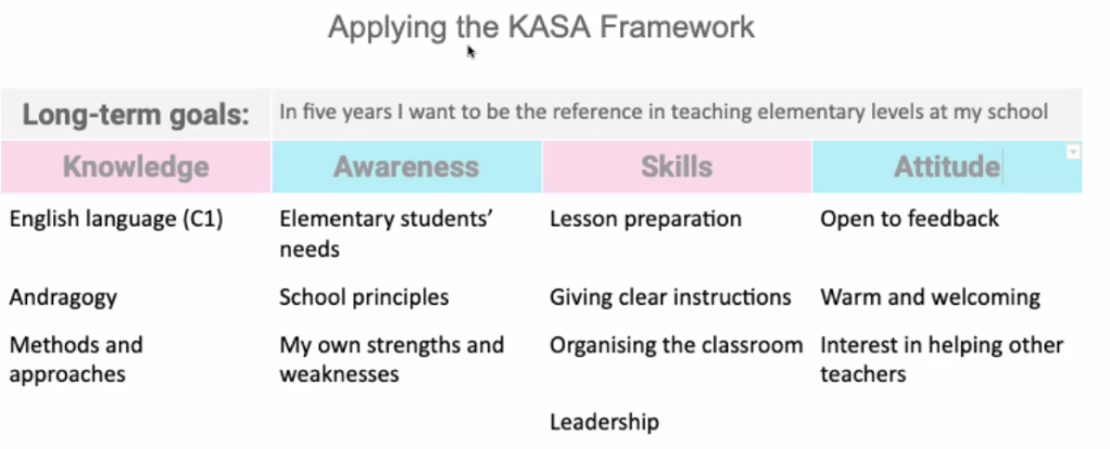 Next, we need to think about stages, stage aims, etc. And here Rubens introduced Freeman’s KASA framework. I had seen this before, but I haven’t actually worked with it. Rubens showed us how this framework could be used to help teachers plan their development goals, which I thought was excellent.
