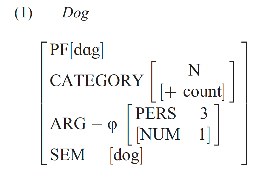 - Language acquisition is an implicit process: The authors, and many other SLA and ISLA researchers, linguists, etc. state that, in effect, acquisition is an implicit process. That is, implicit learning, not explicit learning, is what leads to interlanguage development and, thus, language development. To make this a little clearer, first we need to understand what is meant by language system – and this is where it gets a little abstract. Why? Well, language is abstract, and the formal linguistic system that the learner is learning is very complex, involving ‘inputs’ such as Tense, Case and Question, as well as “operations such as Move and Agree” (VanPatten & Smith, 2022, p.14) – all within a specific set of language universals. What the authors are trying to get at is that it is highly unlikely, if not impossible, that a learner tries to ‘learn’ these features. To give an example of how complex the system is, take a look at the lexical entry presented for the word ‘Dog’ (see below). This is a representation of how the word is stored in the lexicon (as a morpheme) – we can see that it is quite difficult to be able to ‘learn’ all of this and be attending to this during communication. We can also think about a syntactic example using What did you eat? This question “involves moving what, which is the object of the eat, to the beginning of the sentence to form a question”. This is a very simple example, involving Move, but they can get far more complex!