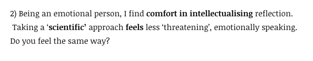 I find having a framework is easier to work from, and I do think that by intellectualising it, it becomes a little more ‘accessible’ and understandable. In the conclusion, Farrell (2022, p.47) talks about not seeing reflective practice as an intellectual exercise, and notes that his model aims to bring in the “spiritual, moral, emotional, or noncognitive aspects” as well – in effect, a more holistic approach to reflection. But like he said before this, before we engage in reflection we need to discuss whose tradition of reflection we are engaging in. For example, if we take a Dewey-like approach, then intellectualisation becomes part of the reflection.