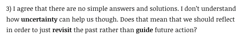 Yes, the uncertainty bit is a little hard to digest. It sounds like a waste of time if you don’t reflect-for-action. Then again, Girish and Zhenya’s comments on my blog, as well as Matthew’s words made me think of the importance of reflecting in order to appreciate our own growth and look at our ‘weaknesses’as part of your journey. Maybe it helps build confidence? Reflection-for self-appreciation rather than reflection-for-action? 🤔 Dunno!